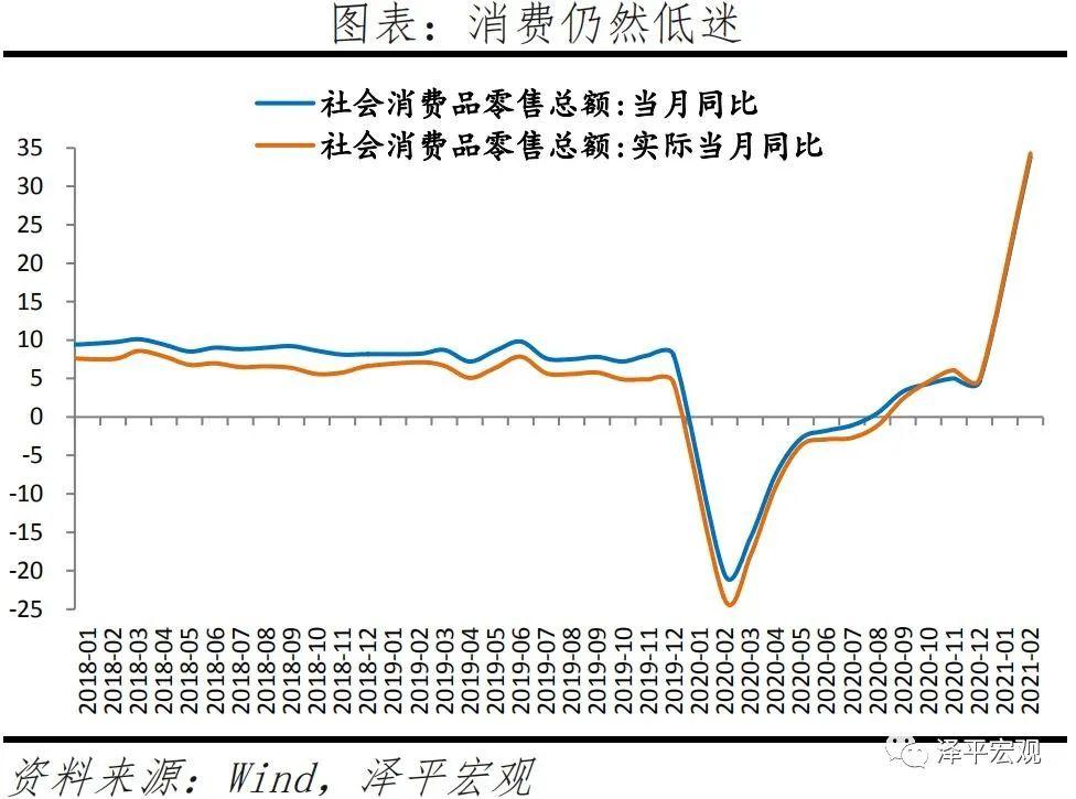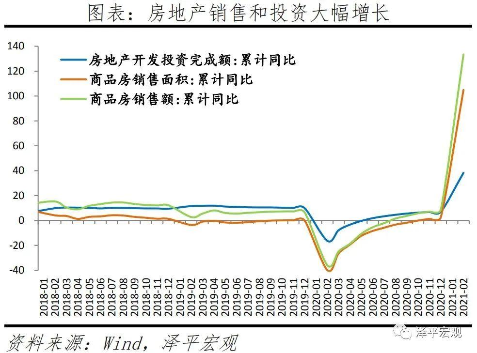 需求侧,三驾马车中,出口维持高增,房地产投资韧性较强,基建和制造业投资较弱,消费仍低迷。外需持续修复和低基数影响下,1-2月中国出口(以美元计)同比增长60.6%,超预期高增。房地产投资累计同比38.3%,较2019年同期增长15.7%,两年平均同比7.6%;基建投资(含水电燃气)累计同比35.0%,较2019年同期降1.3%,两年平均降0.7%;制造业投资累计同比37.3%,较2019年同期降5.9%,两年平均同比降3%。社会消费品零售总额同比增长33.8%,较2019年同期增长6.4%,两年平均增速为3.2%。