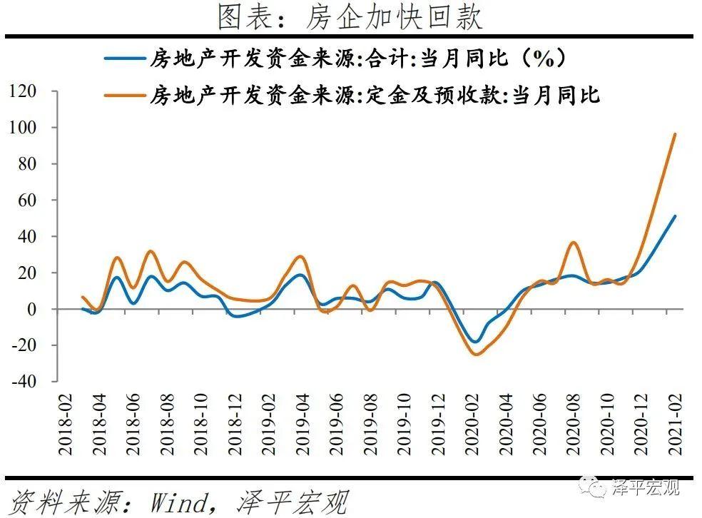 1-2月商品房销售面积和销售额累计同比分别为104.9%和133.4%,同比大增,即使较2019年同期也分别增长了23.1%和49.6%。房企通过降价促销等政策加快回笼资金,1-2月房地产开发资金来源累计同比增长51.2%,其中国内贷款、自筹资金、定金及预收款分别增长14.4%、34.2%和96.3%。
