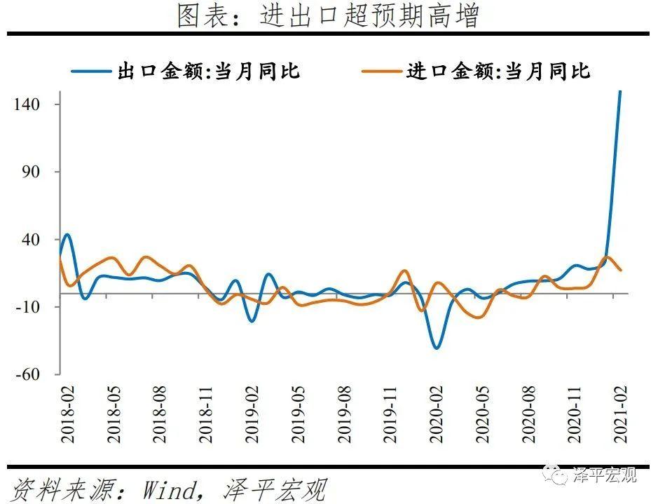1-2月中国出口(以美元计)同比增长60.6%,较去年12月上升42.5个百分点。出口超预期高增,主因外需持续修复和去年低基数。2月全球综合PMI为53.2%,美、欧、日制造业PMI分别为60.8%、57.9%和51.4%;海运需求旺盛,海运价格持续突破历史新高,2月中国出口集装箱运价综合指数(CCFI)平均值为2063.8,而去年同期仅为920.7;贸易风向标韩国2月出口同比13.9%。分地区看,对主要经济体出口均有所上升,1-2对美国、欧盟、东盟、日本和韩国的出口同比分别为87.3%、62.6%、53.0%、47.0%和49.0%。分产品看,劳动密集型产品出口随着外需恢复而恢复,纺织、箱包、服装和玩具等劳动密集型产品出口同比为60.8%、24.8%、50.0%和96.8%,农产品、机电产品和高新技术产品出口同比分别为24.1%、64.7%和58.1%。