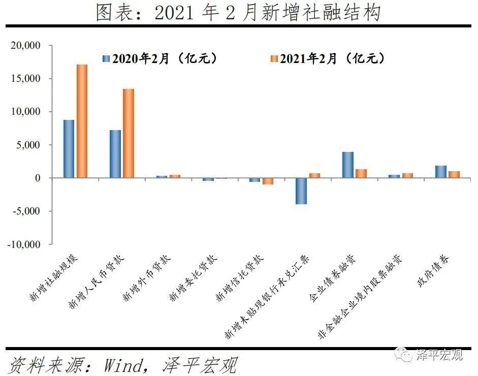 从社融结构看,实体融资需求强劲,企业、居民部门接力政府部门加杠杆。信贷、未贴现汇票构成社融主要支撑,企业债券、政府债券构成主要拖累。2月新增政府债券融资1017亿元,同比少增807亿元;新增人民币贷款1.34万亿元,同比大幅多增6211亿元,居民贷款、企业中长期贷款构成主要支撑;表外融资减少396亿元,同比大幅少减4461亿元;新增企业债券融资1306亿元,同比、环比分别少增2588亿元、少增2445亿元;新增股票融资693亿元,环比少增298亿元,春节后美债利率大幅上行,带动国内股市估值调整,抱团股大幅下跌,股市交易热度有所回落,或带动股票融资降温。