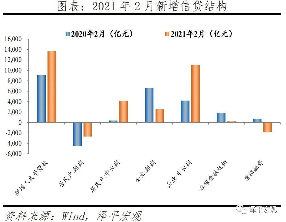 从信贷结构看,实体投融资需求较强,结构性货币政策工具和信贷政策精准滴灌,中长期贷款新增1.1万亿元创历史同期新高。2月新增企业贷款1.2万亿元,同比多增700亿元;短期贷款、中长期贷款、票据融资分别大幅少增4052亿元、大幅多增6843亿元、多减2489亿元;新增居民贷款1421亿元,同比大幅多增5554亿元。