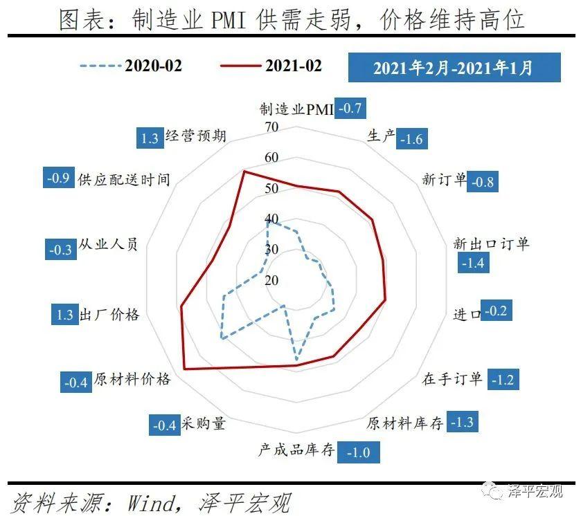 1)供需扩张力度减弱。2月生产指数和新订单指数分别为51.9%和51.5%,较上月回落1.6和0.8个百分点,但仍处于临界点以上。供需两端扩张力度连续两个月减弱,经济增长边际放缓,经济复苏进入顶部区间。生产端下滑幅度加大,供需差值有所缩小,去年3月以来快速修复的生产逐渐向需求回归。2月新出口订单指数为48.8%,较上月回落1.4百分点,重回荣枯线下。