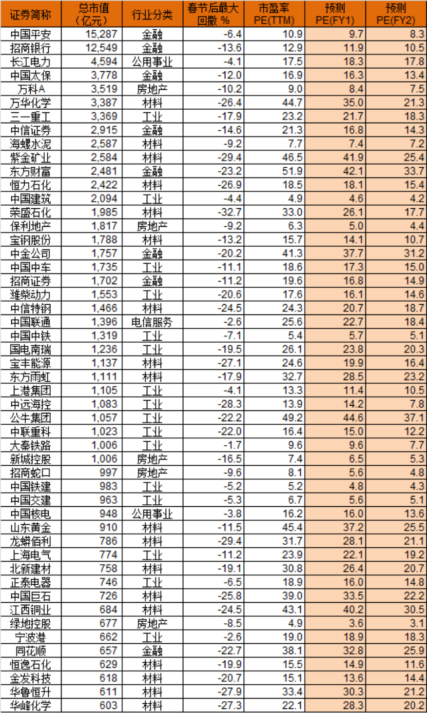 从筛选结果来看,金融、周期、制造业行业龙头个股在春节之后的调整幅度相对较小,并且由于行业增速中枢相对于大消费科技来说较低,所以历史上给的估值水平也相对较低,尤其是银行、地产、建筑、公用事业等。