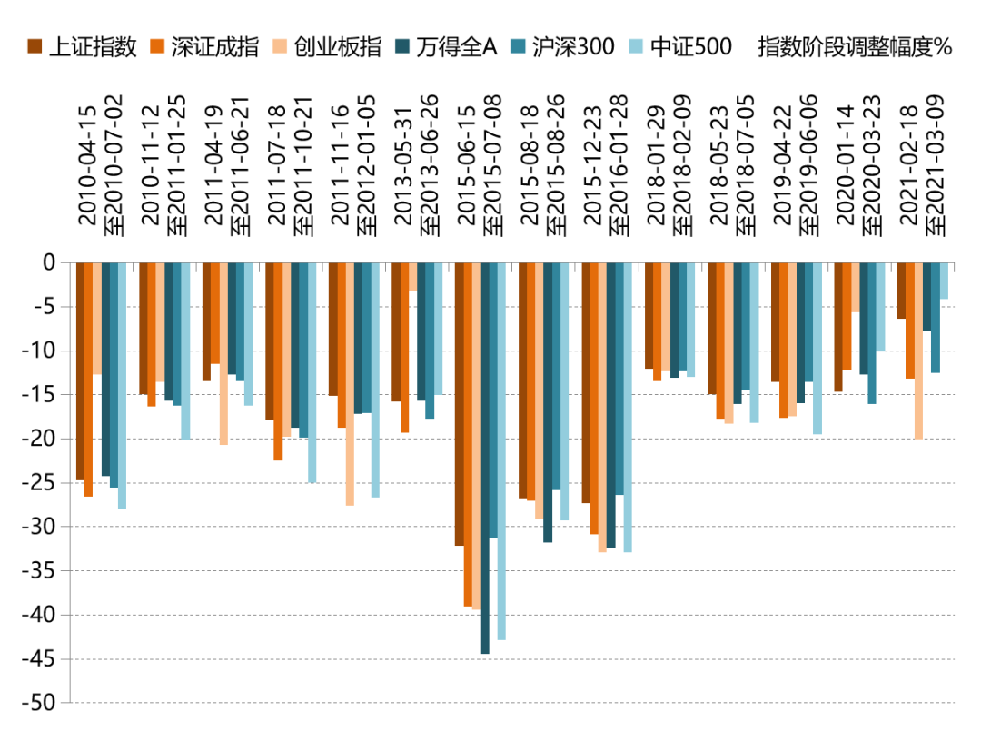 今年以来市场波动较为剧烈,尤其是春节前后对比反差相当明显。为此,我们统计了过去十年,即自2010年以来市场阶段调整幅度较大的时候,主流宽基指数的调整幅度对比。
