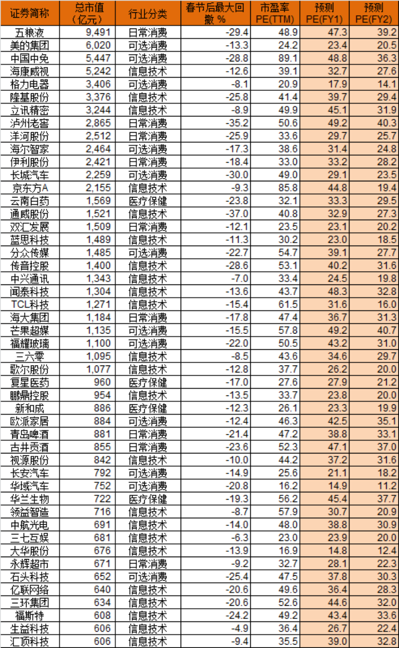 从筛选结果来看,春节之后的调整幅度多在-20%至-35%之间,经过调整之后,虽然当前TTM的PE估值有些个股还高于50倍,但是如果动态来看,考虑到2021年经济的快速复苏回升,企业业绩弹性释放,2021年部分行业龙头白马的估值大多降至50倍以下,甚至在40倍以下。