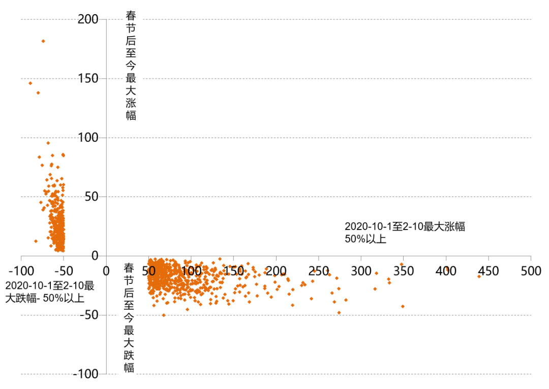 另一个角度来看,自2020年10月以来至春节前2月10日,最大涨幅超过50%的个股,在春节后至3月9日的最大跌幅,大多在-20%以上,部分个股甚至达到-40%、-50%的幅度。正是由于春节前后的强烈反差对比,导致投资者的体验并不好。