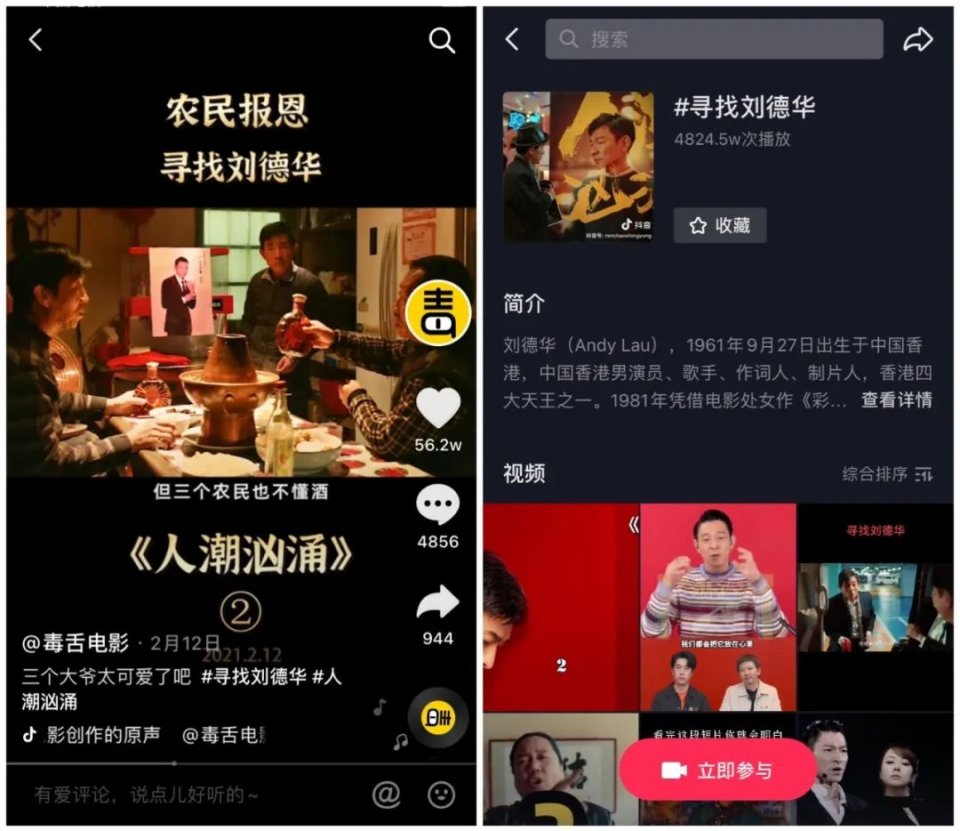 其中抖音联合片方光线传媒推出的电影番外短片《寻找刘德华》,有来自《平原上的夏洛克》主创们的精彩演绎加持,剧情上深度植入了“刘德华入驻抖音”的创意内容,达到了破圈传播的效果;同时因电影触发大众情绪痛点而引发网友纷纷自主发布电影相关短视频,也带来了意想不到的惊喜效果。