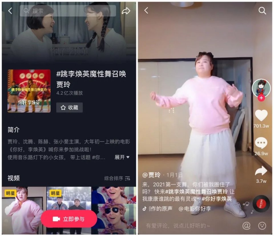 最终的效果也可谓显著,除了活动话题#跳李焕英魔性舞召唤贾玲 的累计播放量达到了惊人的4.2亿,贾玲个人发布的单条视频也收获高达1.8亿播放,成功实现了“圈层击穿”。