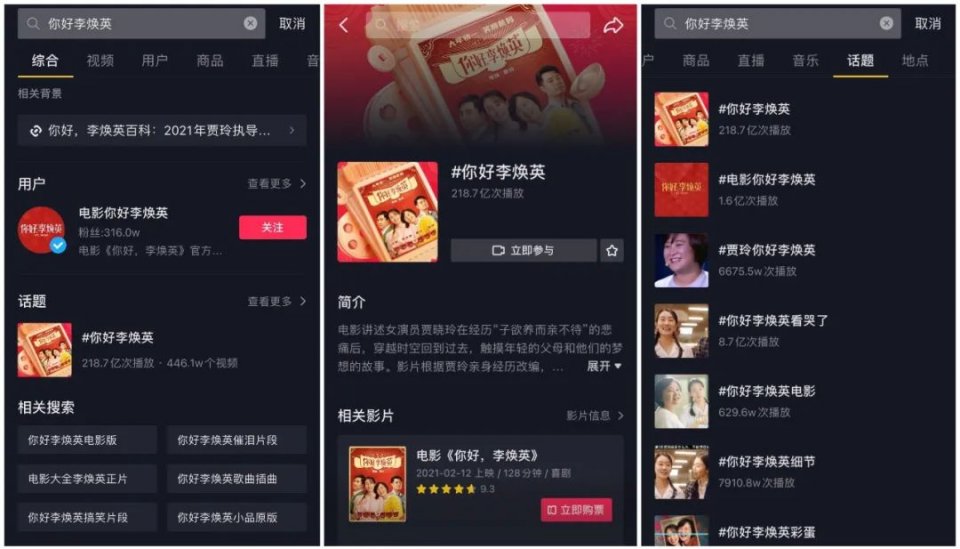 回到电影《你好,李焕英》的营销流程,整个春节档期间,无论是创下218亿播放量的主话题,还是15个播放量破亿的子话题,都在无形中助长电影舆论的火热态势。