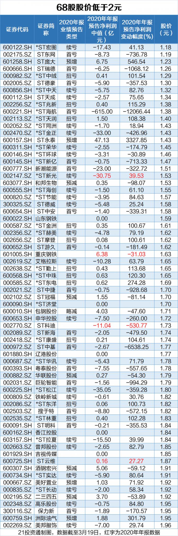 自去年以来,A股的退市节奏有所加快。目前市场上的低价股并不少,据21投资通统计,剔除退市股以及退市整理期、暂停上市个股,市场上目前有68股股价在2元以下。