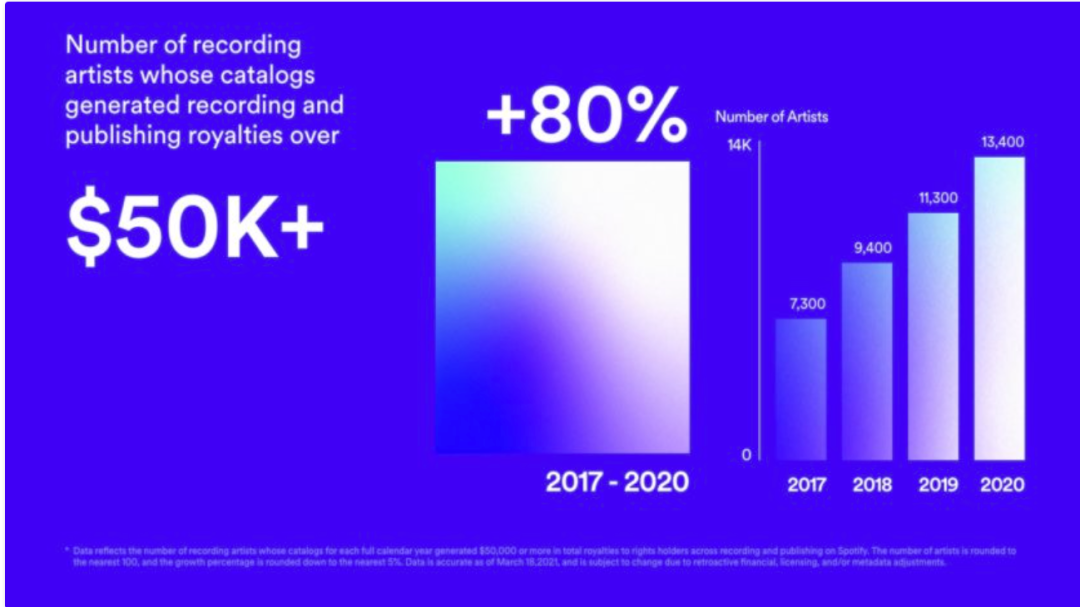 Loud&Clear数据显示,在2020年,Spotify中约13400名音乐人通过该平台获取了超过5万美元的收入,几乎是2017年7300人的两倍;而在2020年,Spotify上年收入超过10万美元的音乐人数量为7800人,四年增长了85%;年收入超过50万美元的音乐人数量为1820,四年增长了90%;年收入100万美元的音乐人数量为870,四年增长了90%。