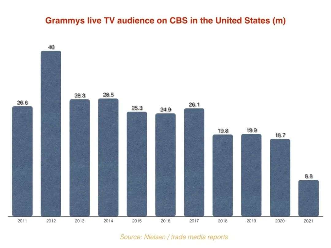 据Nielsen报告,在美国只有2.1%的18到49岁的年轻人收看了格莱美,而97.9%的人没有收看。2020年,这一数字为5.4%,2019年为5.6%。