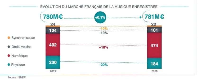 根据SNEP的数据,实体唱片和数字音乐销售收入共增长了4%,达到6.58亿欧元(约7.44亿美元);整体实体唱片销售下降了20%,从2019年的2.3亿欧元(约2.58亿美元)降至1.84亿欧元(约2.08亿美元)。