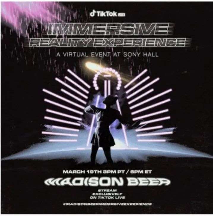 虚拟演唱会由索尼音乐娱乐公司、TikTok、Verizon与Sony Immersive Music Studios共同合作推出,据悉,“The Madison Beer Immersive Reality Concert Experience”结合3D动捕、容积捕捉和3D重建技术,利用Fortnite制造商Epic Games的游戏引擎开发而成。尽管Beer的表演是在动捕工作室中录制,但虚拟演唱会的场地将还原美国纽约的索尼音乐厅,线上观众在VR中可体验身临其境的观感。