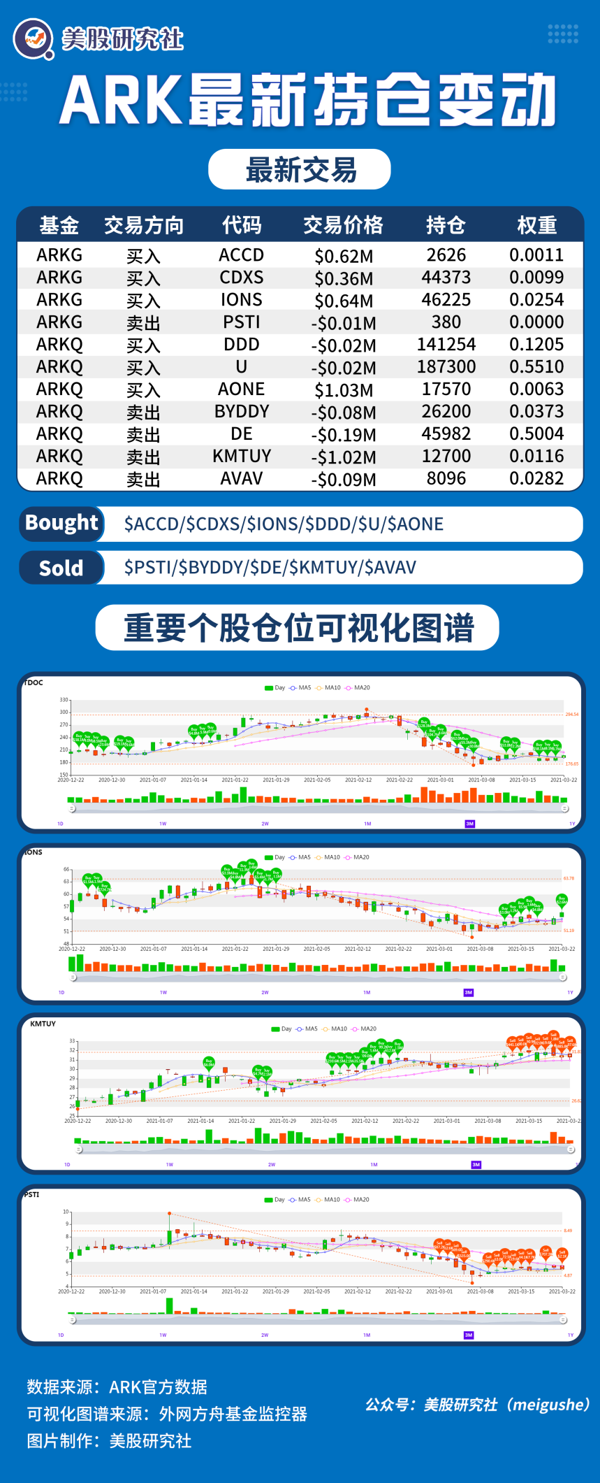 由于ARK基金管理的ETF的业绩非常出色,ARK会公布每日持仓动作。3月23日,美股研究社整理该基金持仓动作如下: