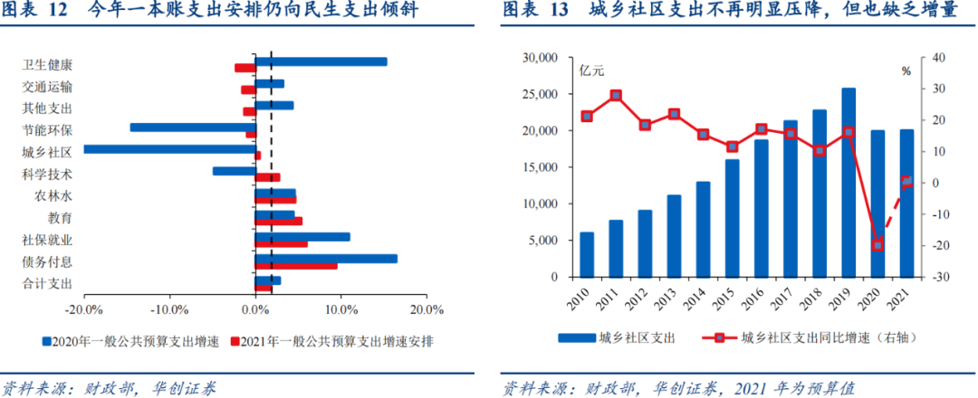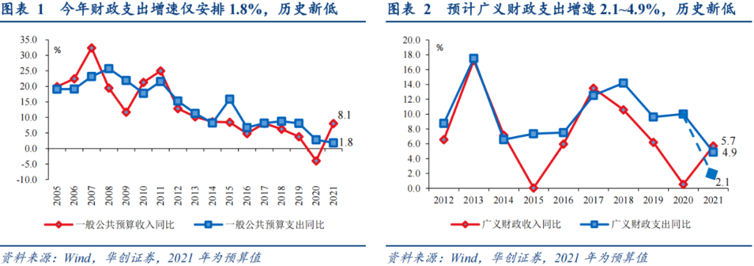 如何理解预算草案中的“实际可用的财力总量增幅较低”?我们理解就是实际能支出的增量较少,量化体现即为今年的支出增速安排创新低:2021年全国一般公共预算(“一本账”)支出安排250120亿元,增长1.8%,增速创历史新低。若合并一般公共预算和政府性基金预算(“二本账”)支出考量,我们估算2021年广义财政支出增速约2.1%~4.9%,也为历史新低,较去年的10.1%降幅过半。