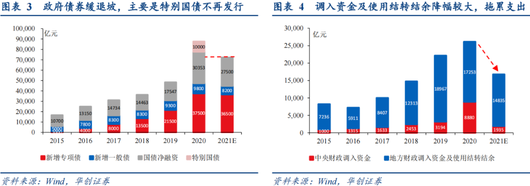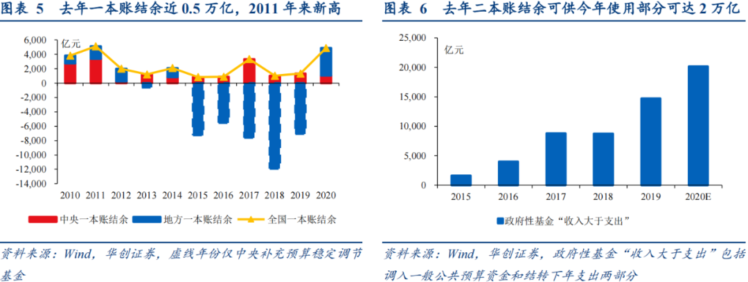 需要指出的是,市场此前担心的2020年财政“剩钱”——一本账约0.5万亿的结余资金和二本账约2万亿“收入大于支出”规模虽大,但其中可用于下年支出的部分已被考虑在今年调入资金及使用结转结余的安排中,表明2020年财政“剩钱”多用于平衡收支或为未来困难情况预留,并未转化为2021年强支出安排。