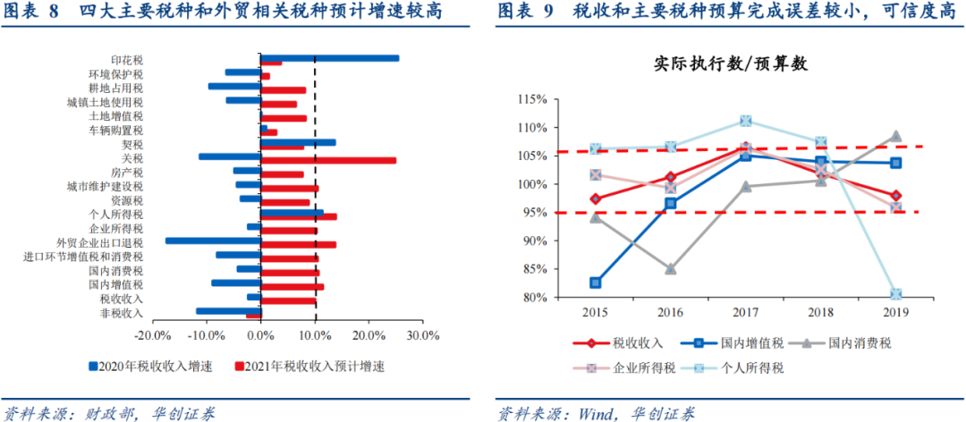 从税收分项增速来看,经济恢复性增长态势较强,外贸形势更乐观:四大主要税种今年均预计双位数增长,外贸相关税种增速预计明显更高(关税预计增长24.8%,出口退税预计增长13.8%),土地相关税种预计增速则相对较低。
