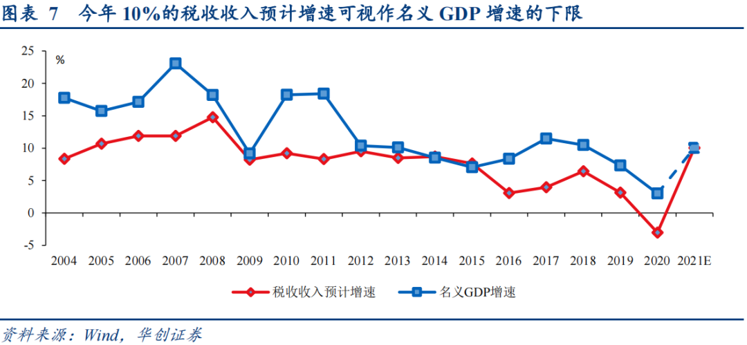从往年经验看,财政预测税收收入基于的经济假设偏谨慎,因此税收收入预计增速可以视作名义GDP的下限。今年税收收入预计增长10%,意味着名义GDP增速的下限或约 10%。以今年赤字规模和赤字率倒算的名义GDP增速目标为9.8%,在10%下限附近,也证明政府对今年经济的假设是偏保守的。