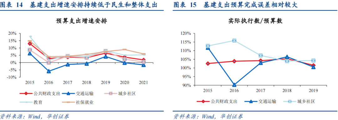 从一般公共预算支出的分项安排看,仍向民生支出倾斜,基建支出接近零增长。民生支出中,社保就业支出在高基数上继续安排高增(5.9%),科学技术安排恢复正增长、农林水(包括扶贫支出)、教育支出安排增速超去年实际增速,卫生健康支出则随疫情防控形势转好安排负增长。基建支出中,地方主导的城乡社区支出今年不再明显压降,但也缺乏增量,0.5%的增速安排仍低于整体;中央主导的交通运输支出自2018年来首次安排负增长(-1.6%),两项基建支出合计约安排零增长——我们注意到近年来基建支出增速安排持续低于民生和整体支出,显示在“资金用在刀刃上”要求下,偏低的基建支出增速安排已成常态。
