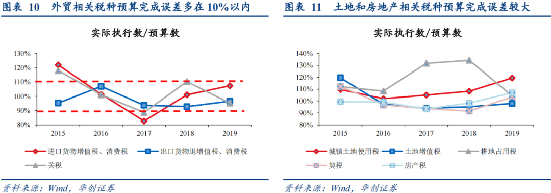 税收收入整体和四项主要税种的预算完成误差较小(多在5%以内),预算可信度相对较高;外贸相关税种预算完成误差多在10%以内,考虑到今年预计增速极高(关税、出口退税实际增速即便减去10%也有近15%、近5%),预算对外贸形势的乐观预计仍有参考意义;土地相关税种预算完成误差相对较高,今年预计低增的参考价值相对较小,车辆购置税、印花税也是同理。