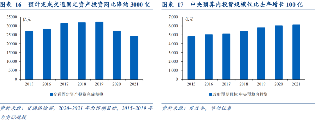 由于城乡社区、交通运输两项基建支出的预算执行误差相对较大,基建支出承压仍需其他佐证,目前较具代表性的有两条:一是今年交通运输部公布的预计完成交通固定资产投资规模仅2.4万亿,较去年降约3000亿。二是发改委公布的中央预算内投资今年为6100亿,仅较去年增长100亿。