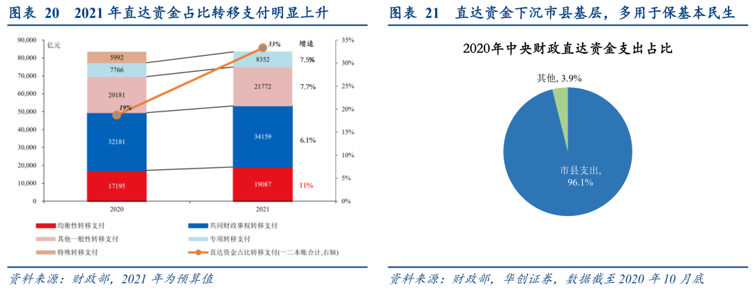 2020年财政政策的一大增量是中央直达资金(省级不截留,直达市县基层),极大提高了财政资金惠企利民的效率。据《2020年中国财政政策执行情况报告》介绍,“仅用20天时间,就将95%的中央直达资金下达市县基层,省级财政细化下达时间平均只有1周,速度前所未有”。2021年政府工作报告对中央直达资金的表述为“建立常态化财政资金直达机制并扩大范围,将2.8万亿元中央财政资金纳入直达机制、规模明显大于去年,为市县基层惠企利民提供更加及时有力的财力支持”。据预算草案,中央财政直达资金范围扩大后,将“基本实现中央财政民生补助资金全覆盖”。