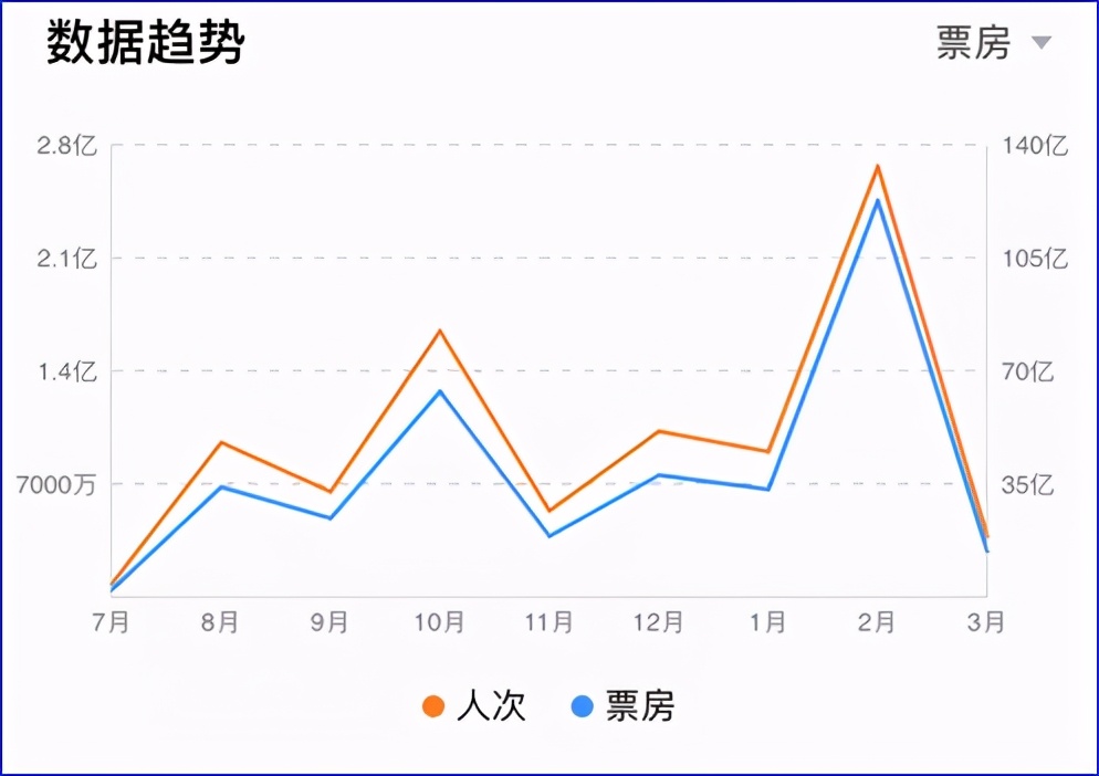 事实也是如此,进入3月份后,观影人数、电影票房均发生骤降。特别是从3月的第二周开始,日票房的数据基本维持在3000万左右,相比前一周下滑了近一倍。