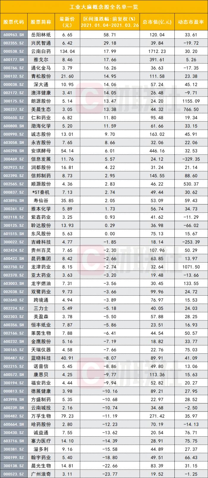 据星矿数据显示,截至3月26日,A股工业大麻概念板块的上市公司总计有54家,这54家上市公司的市值累计超过5000亿元。多数公司主要布局工业大麻种植方面。
