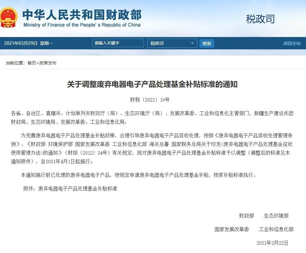 财政部、生态环境部等四部门联合印发《关于调整废弃电器电子产品处理基金补贴标准的通知》,自2021年4月1日起施行。