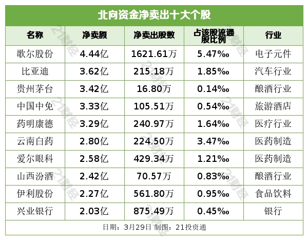 北向资金净卖出歌尔股份(002241.SZ)、比亚迪(002594.SZ)、贵州茅台(600519.SH)居前,其中,歌尔股份被净卖出4.44亿元,比亚迪、贵州茅台、中国中免、药明康德被净卖出逾3亿元。
