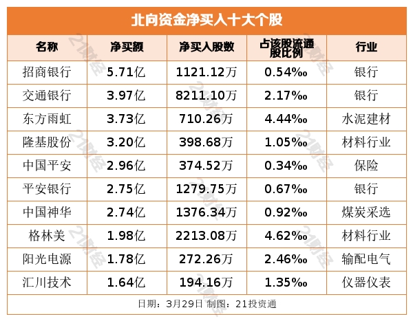 个股方面,北向资金净买入招商银行(600036.SH)、交通银行(601328.SH)、东方雨虹(002271.SZ)、隆基股份(601012.SH)、中国平安(601318.SH)居前,其中,招商银行被净买入5.71亿元,交通银行、东方雨虹、隆基股份被净买入逾3亿元。