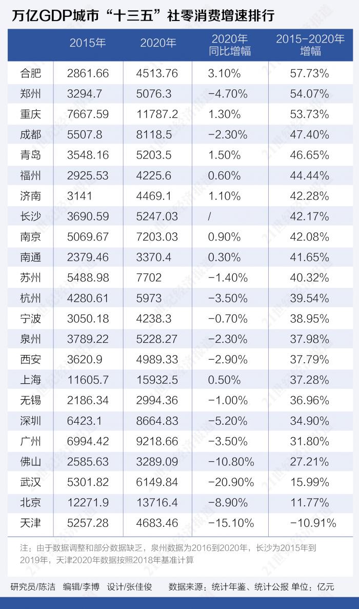 扣除合并代管的因素,重庆、郑州成为“十三五”时期社零消费增速最快的万亿GDP城市,重庆成功突破社零消费万亿大关,成为我国第三个万亿社零消费城市。