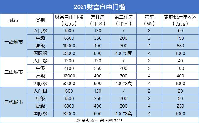 胡润研究院发布《2021胡润财富自由门槛》显示,中国一、二、三线城市入门级财富自由门槛分别为1900万元、1200万元及600万元。国际级财富自由门槛是3.5亿元人民币,相当于5000万美金。