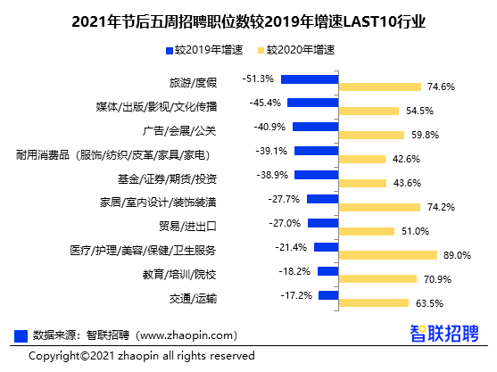疫情对旅游度假、广告会展、家居装饰、美容保健等依赖线下场景行业的影响仍在持续,其2021年节后五周招聘需求虽较2020年疫情下大幅增长,但仍较2019年同期分别下降51.3%、45.4%、27.7%、21.4%。传统媒体出版行业则受数字媒体冲击人才需求萎缩。