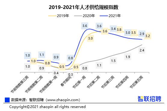 [2]供给规模指数均以当年节前倒数第三周简历投递量为基数(1),反映逐周求职行为规模走势,大于(小于)1代表当周简历投递量大于(小于)节前倒数第三周。