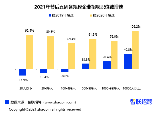 受疫情冲击更大的小微企业取得一定恢复,百人以下企业今年节后五周招聘需求同比增长九成。但与2019年同期相比,小微企业降幅仍在1成以上,而500-999人、1000-9999人、万人以上大中企业招聘需求较2019年同期增幅分别达13.8%、20.4%、40.8%。疫情使得小微企业与大中企业间的马太效应加剧。此外,智联招聘调研也多次展现出求职者在后疫情时代更倾向大企业的求稳心态,可见小微企业正经受着发展与引才上的双重考验。