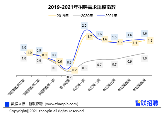 [3]需求规模指数均以当年节前倒数第三周招聘职位数为基数(1),反映逐周招聘规模走势,大于(小于)1代表当周招聘职位数大于(小于)节前倒数第三周。