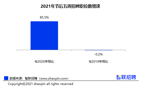 2021年节后五周[1]招聘职位数超去年85.5%,追平2019年