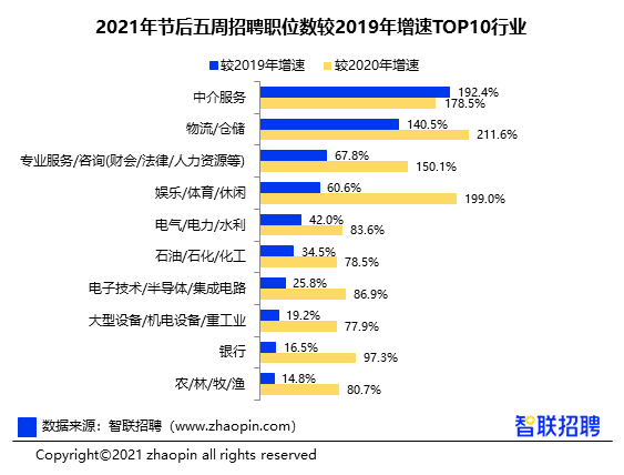 分行业看,部分行业较去年招聘需求大幅提升,甚至超过2019年同期水平:中介服务、物流仓储、专业服务、娱乐休闲等行业,分别较2019年上涨192.4%、140.5%、67.8%及60.6%。