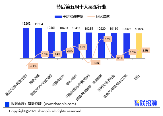 2021年春节后,基金/证券/期货/投资行业连续稳居高薪榜首五周,本周薪酬环比下降2.4%后来到12262元/月。高薪榜单中,具体行业基本与上一周一致,唯有银行业以2.4%的环比增速新晋上榜,达到10024元/月。另外,通信/电信运营、增值服务的招聘薪酬环比增速高达6%,在节后第五周仍蓄力向上。