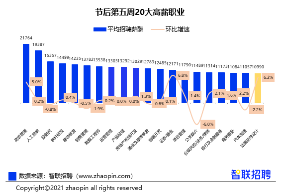 2021年春招期间,高级管理一职持续保持薪酬领先,在春节后第五周仍实现5%的环比增长,达到21764元/月。本周,动画动效设计以6.2%的环比增速新晋上榜,且较节后第一周增长10.6%,薪酬达到10990元/月。作为影视娱乐与游戏行业“视觉担当”之一,专业的设计与操作技能形成动画动效设计职业壁垒,也促使其人才身价在信息视频化的互联网环境中不断增值。