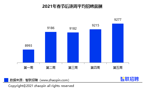 节后第五周平均招聘薪酬为9277元/月,环比上涨0.67%