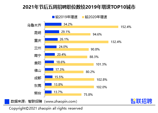 疫情中按下暂停键的武汉快速复苏,今年节后五周招聘职位数比去年同期猛增190.7%,仅比2019年同期减少3.1%,恢复程度超出预期。而在招聘需求较2019年增速前十的城市中,西部城市占据七席,包括乌鲁木齐(34.2%)、昆明(29.1%)、重庆(26.1%)、兰州(24.0%)、南宁(20.4%)、贵阳(18.6%)、成都(15.5%)。西部地区近两年经济发展的提速在招聘数据上也展露无遗。