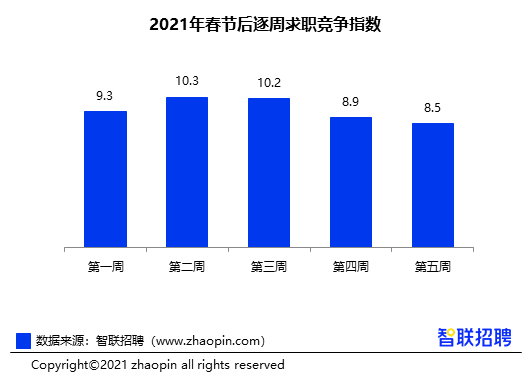 2021年春节后第五周,企业招聘职位数仍有2.6%的环比增长,而求职端则下降4.1%,竞争指数由上一周的8.9小幅下滑至8.5。节后求职竞争指数经历第二周的高值后开始逐周下滑。