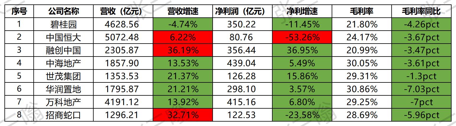 仍然以8家公司为例,营收方面,恒大、融创和招商蛇口的增速同比略有提高,其余5家公司增速都在下滑;净利方面,除恒大外,其他公司的增速都出现了下滑,其中恒大净利润同比大幅减少53.26%,碧桂园和招商蛇口净利润同比分别减少11.45%、23.58%。