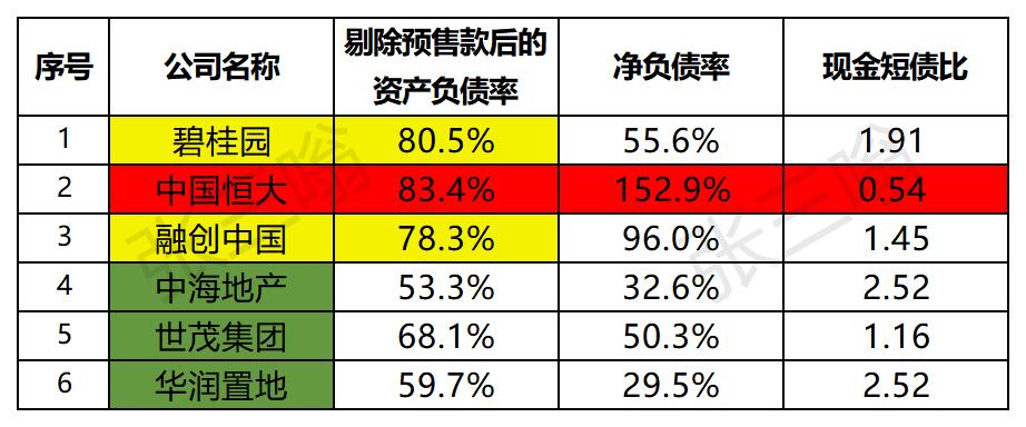 这6家公司中,恒大目前为“红色档”房企,“三道红线”全部触碰;碧桂园和融创为“黄色档”房企,即触碰了一条“红线”,两家公司在“剔除预售款后的资产负债率”指标上尚未达标;其余3家公司均为全部达标的“绿色档”房企。