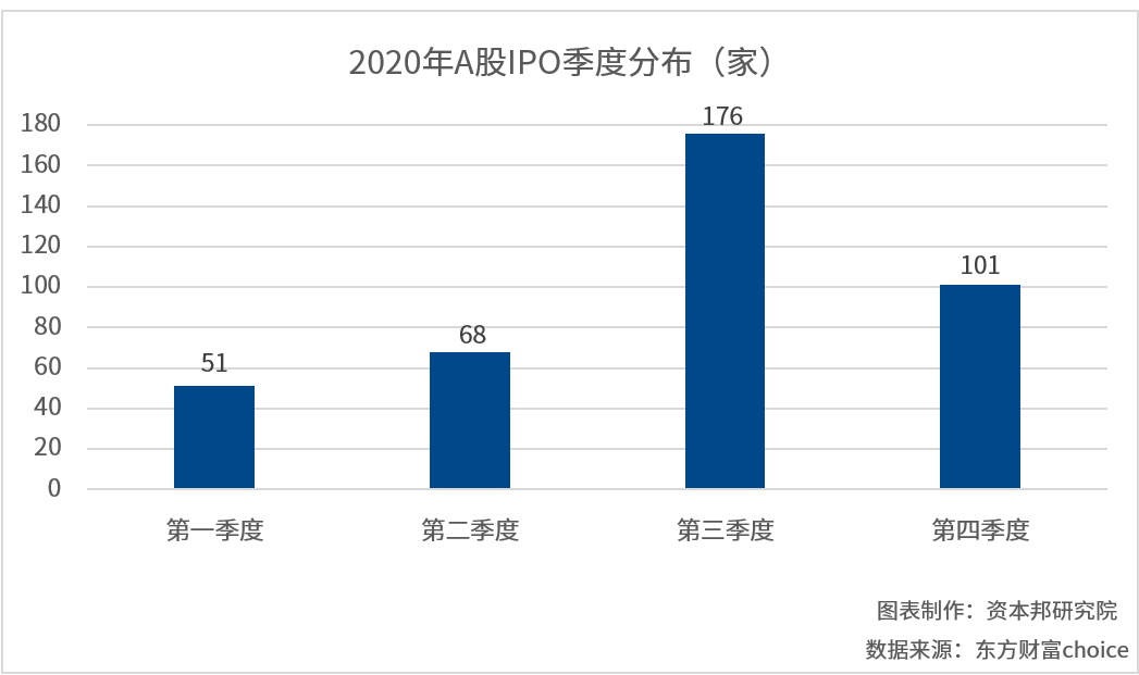从数量来看,根据东方财富choice的数据显示,去年总共有396家企业在A股上市,其中一季度为51家,二季度为68家,三季度达到峰值,为176家,四季度稍有回落,为101家。2021年一季度与去年第四季度基本持平。
