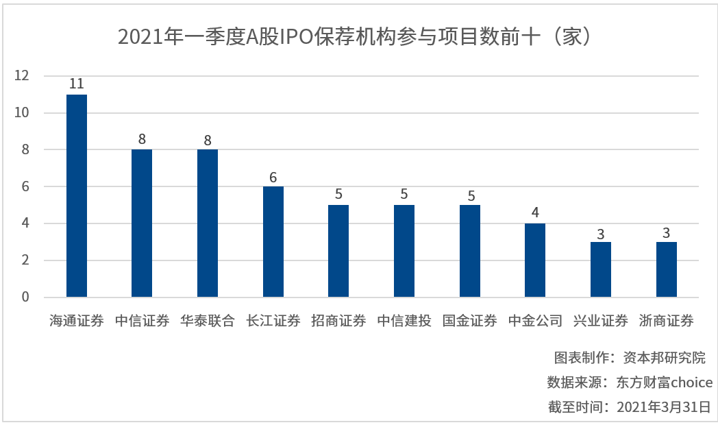 具体保荐机构中,海通证券参与的项目数名列前茅,共担任11家企业承销保荐工作,其次是中信证券,为8家,华泰联合证券也为8家。