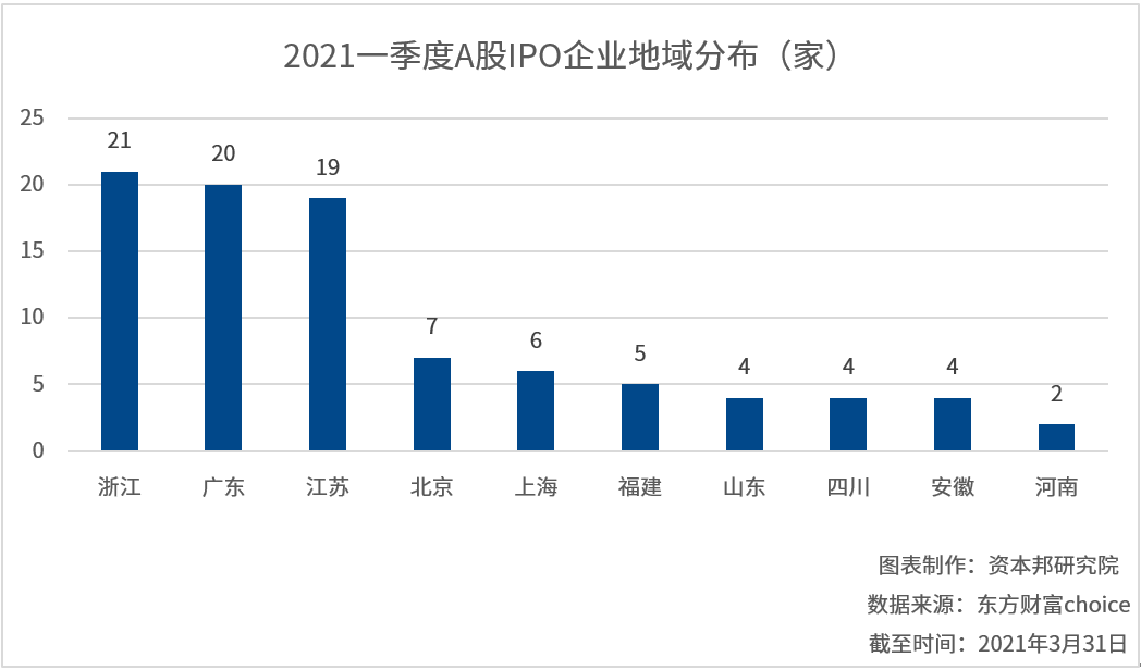 从地域分布来看,一季度浙江共有21家企业在A股上市,名列前茅。其次是广东的20家,排名第三的是江苏的19家,而北京是7家、上海是6家。